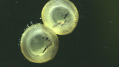 A Canon 600D with a MP-E 65mm was used, the hatching scene at 5X enlargement, and a Zebralight SC51 was used for lighting. It was held inside the aquarium a short distance from the eggs, illuminating them from above and slightly behind.